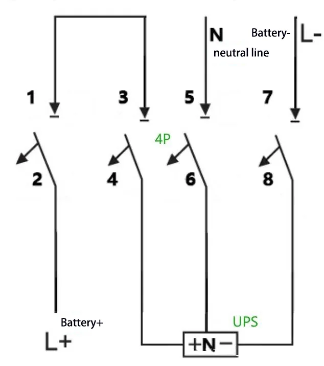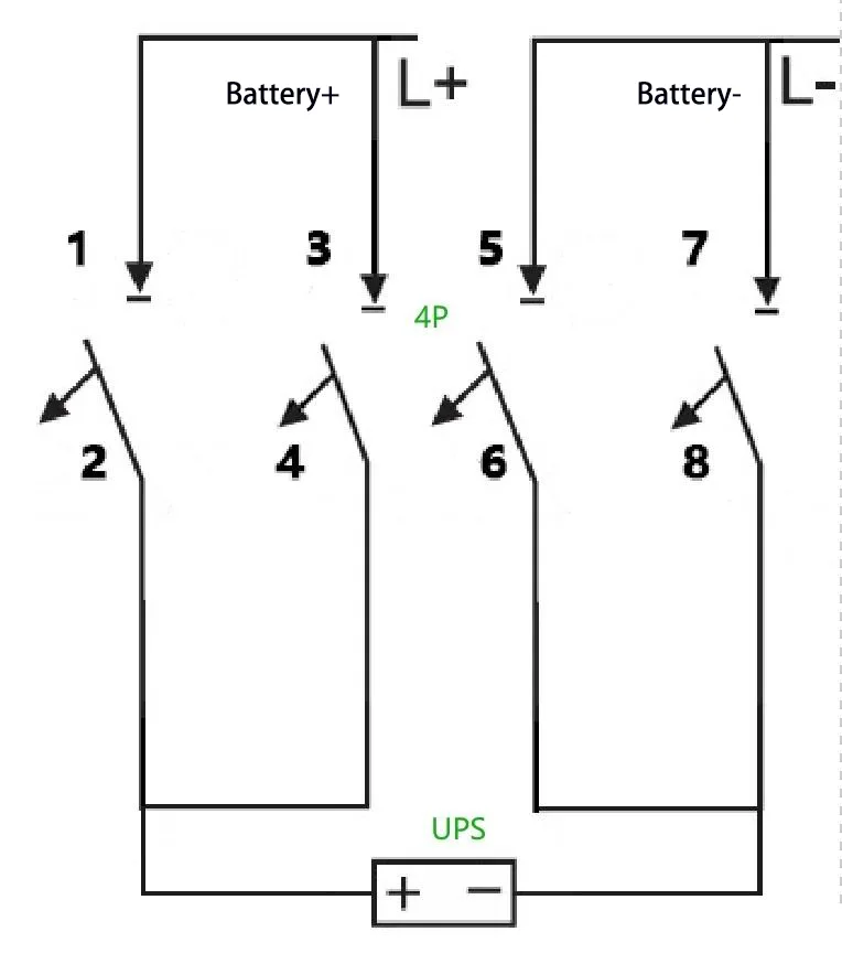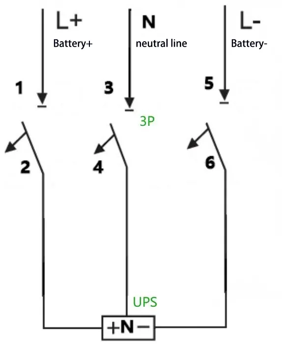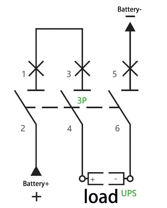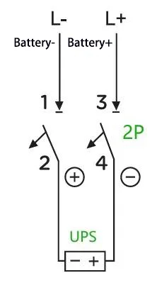 E:Halimbawa: Para sa isang UPS na may kapasidad na 40 kVA, isang naka-rate na string ng baterya na 40 mga cell, at neutral na koneksyon ng wire (nagpapapantay sa boltahe ng singil: 14 V × 40 = 560 V, ibig sabihin, ±280 V), ang maximum na kasalukuyang operating ay kinakalkula bilang 40 kVA × 1.0 ÷ 90% ÷ 90% ÷ 10 V ÷ 1 14 P. 150 Maaaring gamitin ang isang circuit breaker, na ang dalawa sa mga poste nito ay konektado sa serye. Ang pamamaraan ng mga kable ay ang mga sumusunod:
